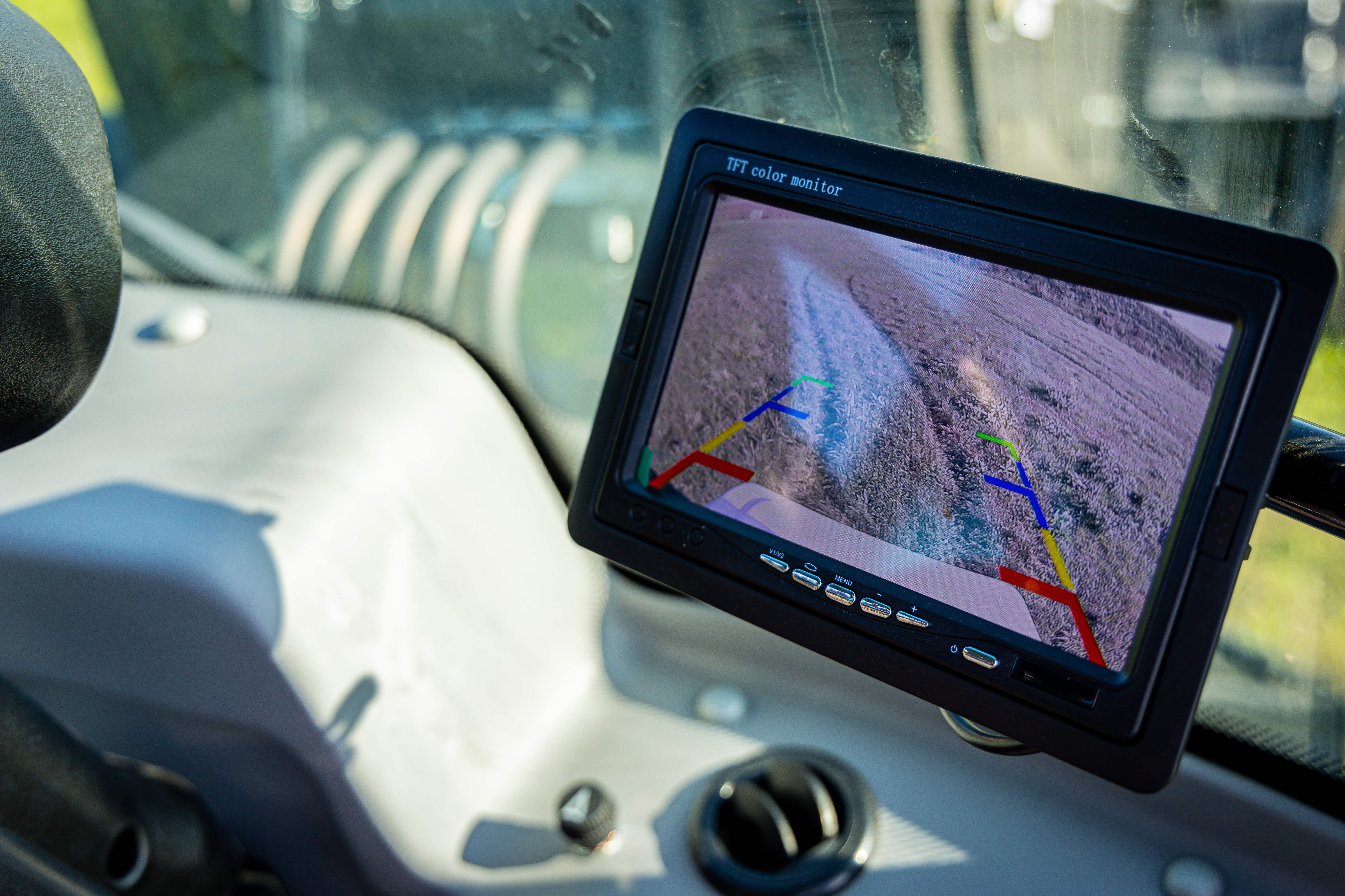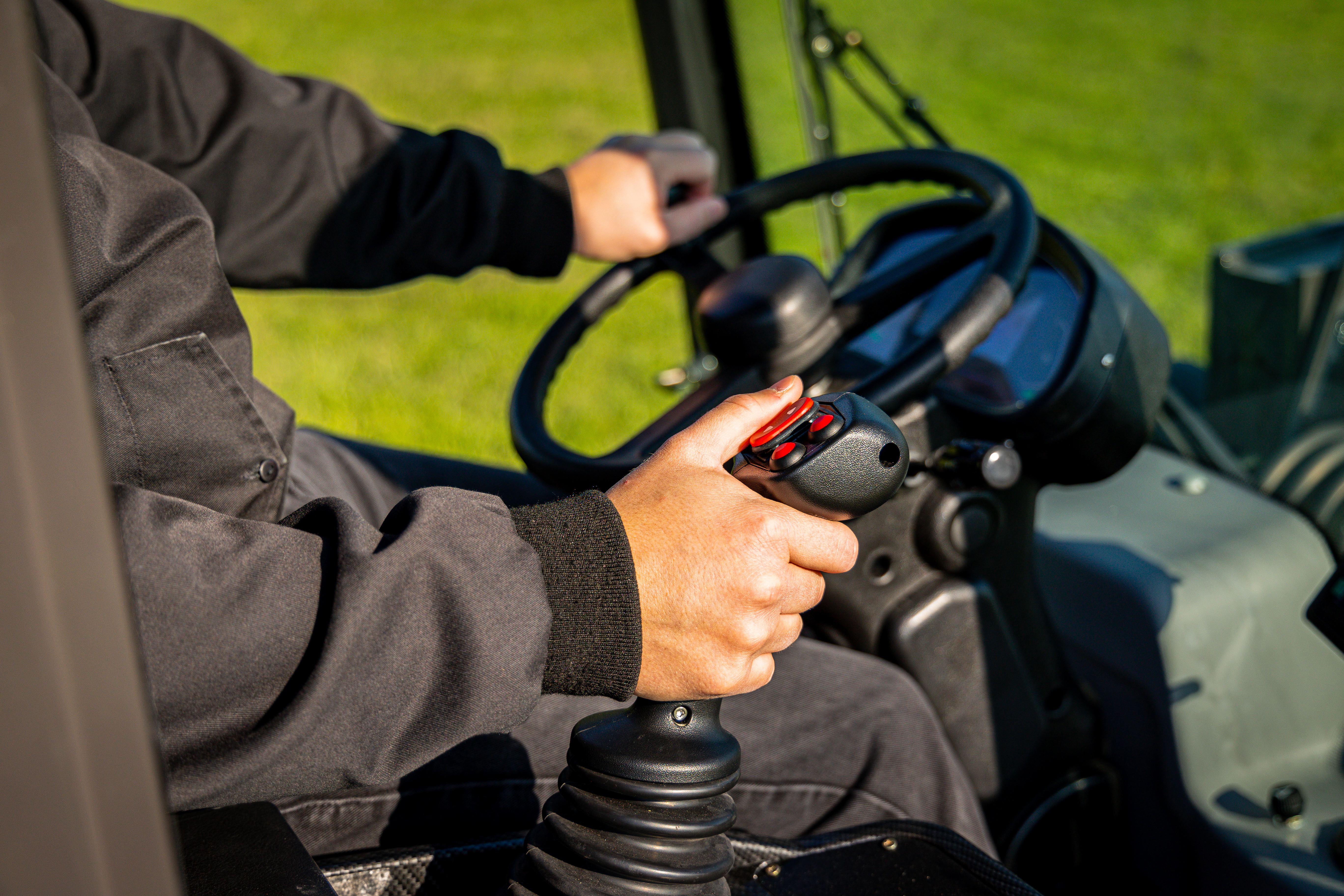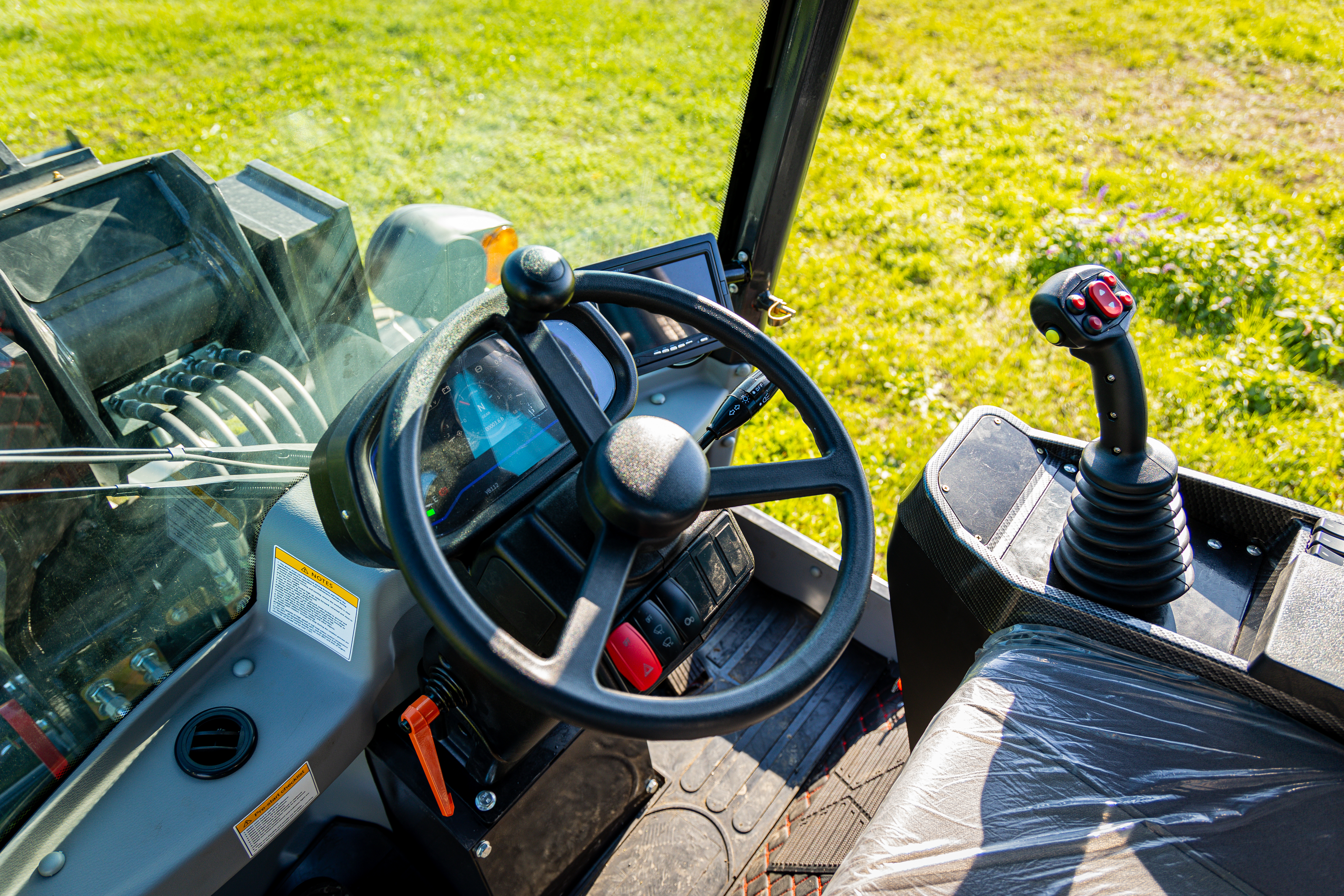 , najmä otáčky motora, stav paliva, tlak v brzdách a teplotu hydraulickej kvapaliny. Joystick a sada tlačidiel (napr. na vypnutie svetiel alebo majáka) sa nachádzajú na paneli vpravo od sedadla.